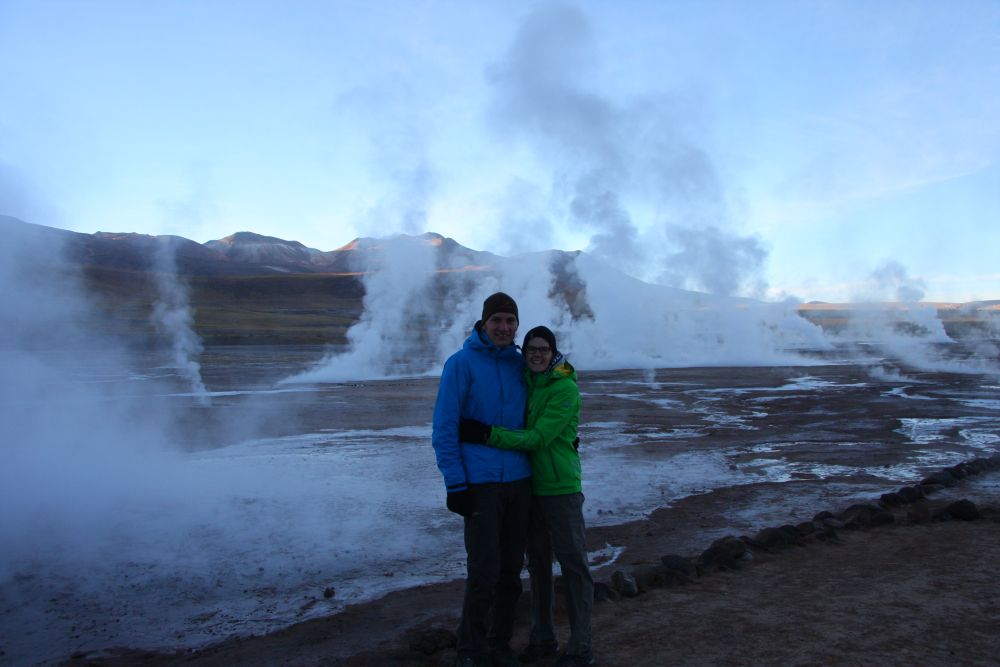 Da es nach der Tour erst früher Abend war, machten wir uns noch auf zu den El Tatio Geysiren, den höchstgelegenen der Welt. Wir suchten uns mal wieder eine Strecke aus von der wir nicht wirklich wussten ob sie in gutem Zustand ist, aber wir wurden angenehm überrascht und konnten so bis in die Nacht hinein fahren. Die letzten 15km waren dafür nur noch eine Wellblechpiste und wir brauchten 1 Stunde. Um 22:00 Uhr waren wir dann mal wieder auf 4300m an der Rangerstation, hatten -9°C in der Nacht und die Chipstüten vergrößerten mal wieder ihr Volumen. Dominik war das nicht zu kalt um den genialen Sternenhimmel abzulichten und so wurde der Wutz passend zu unserem Kennzeichen der Stern der Nacht.