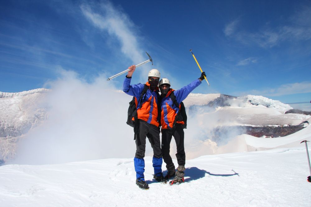 Sandra war nicht so wohl beim Gedanken, dass wir direkt auf dem Vulkan übernachten, aber er hatte ja nicht zu spucken begonnen und somit war es wieder mal eine einsame und ruhige Nacht dort oben. Am Morgen um 7:30 kamen die 4 Guides an und schon ging es mit den anderen 10 Leuten los. Für die ersten 600 Höhenmeter hätte man einen Lift nehmen können, aber keiner wollte der erste sein. Im Nachhinein fragt man sich, warum man bei 1.400 Höhenmeter nicht die Aufstiegshilfe in Anspruch genommen hat; aber nachher ist man immer schlauer. Der Aufstieg bis zur Liftstation war echt fies, wenn über einem die Leute gemütlich im Sessellift sitzen und man sich abmüht über die Geröllfelder nach oben zu kommen. Weiter ging es nun mit Steigeisen und Eispickel um mehr Sicherheit im Schnee zu haben. Zum Glück ist man so auf jeden Schritt konzentriert, dass man es nicht mitbekommt wie steil es wird. Die letzten 200Hm waren echt eine Qual, aber dafür wurde man am Gipfel mit dem Blick in den riesigen Schlund des Vulkans und der tollen Aussicht belohnt. Das nächste Highlight wartete auf uns, und zwar der "Abstieg". Wir mussten noch ca. 100Hm vom Gipfel runter und dann wurden die Steigeisen ausgezogen und man schnallte sich einen Schutz um die Oberschenkel und den Hintern. Auf dem Hintern und wenn es nicht schnell genug war auch mit Hilfe eines Apfelrutschers ging es in Schneerinnen die restlichen 1.300Hm den Berg hinunter. Zum Bremsen hatte man den Eispickel und seine Füße, aber wer will denn schon bremsen? Es war mit Abstand der beste "Abstieg" von einem Gipfel den wir je gemacht haben und obwohl wir danach wirklich total durchnässt waren, waren alle Anstrengungen vom Aufstieg wie weggerutscht. Wir verabschiedeten uns von den Guides mit einem riesigen Grinsen im Gesicht und fuhren dann gemütlich runter nach Pucon auf den Campingplatz "Parque la Poza" um die wohlverdiente Dusche zu genießen und die schweren Beine hochzulegen.